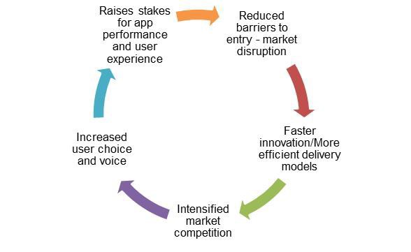 Software creates a virtuous cycle in the enterprise.  In sector after sector, it’s reduced barriers to entry, causing market disruption.  Software enables faster innovation that can be brought to market through more efficient delivery systems.  This intensifies competition as new entrants challenge established players rushing to adapt.  Users gain more choice and voice, which raises the stakes on companies to provide exceptional user experience.  And that user experience is delivered by software.